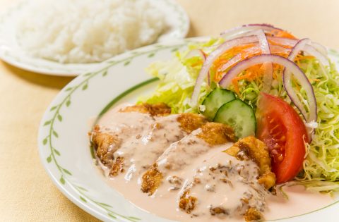 宮崎県のホテルで経験を重ねたご主人が作りだす、秘伝の甘酢ダレとほんのり桃色のタルタルソースがたまらない「オリジナルチキン南蛮」は、お店一番の人気メニュー。