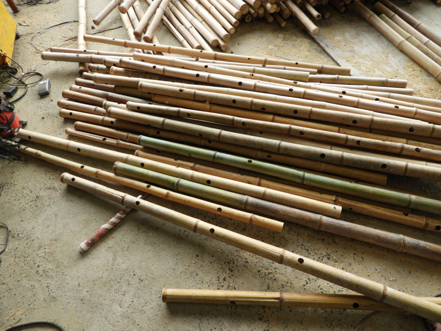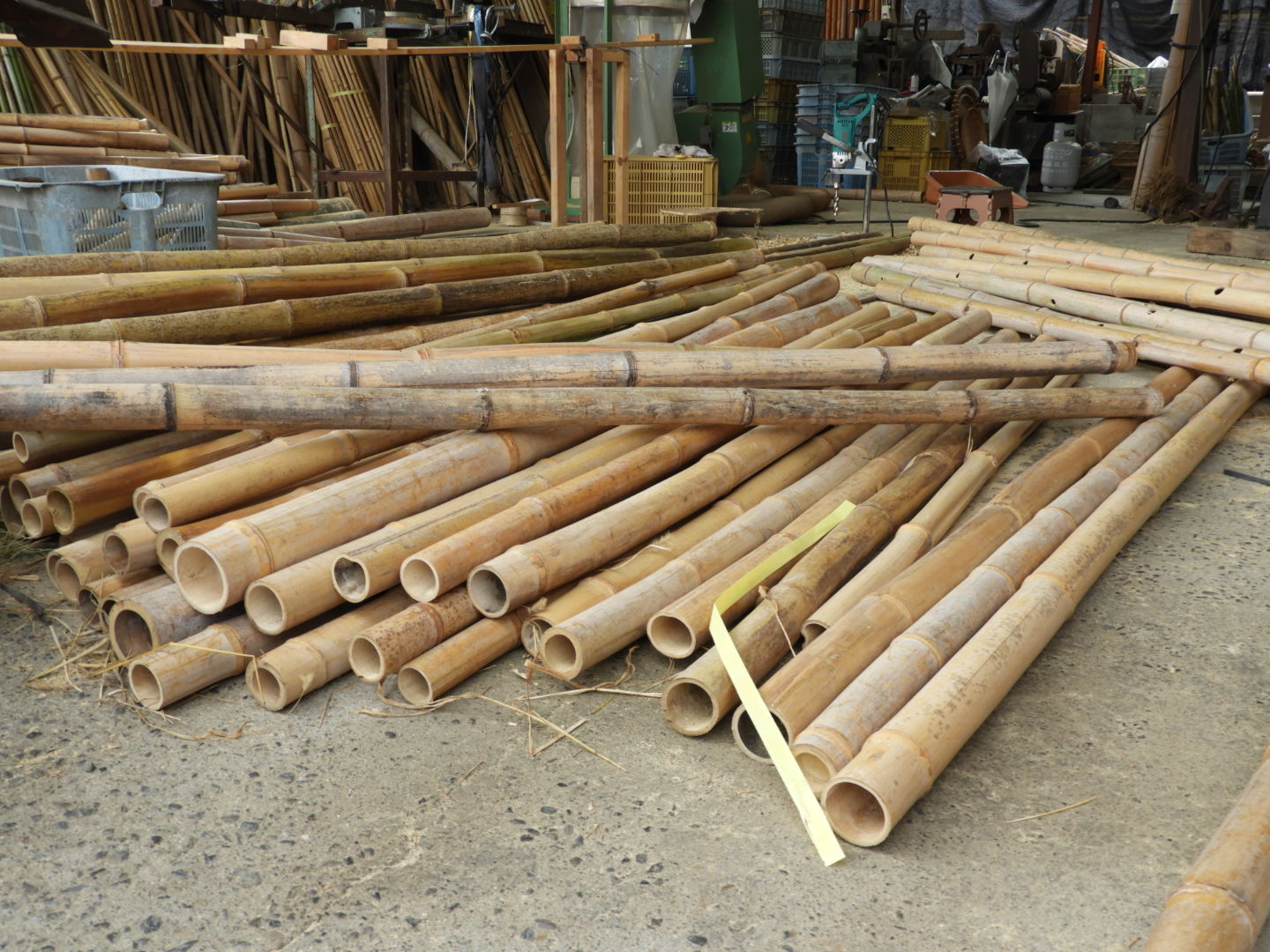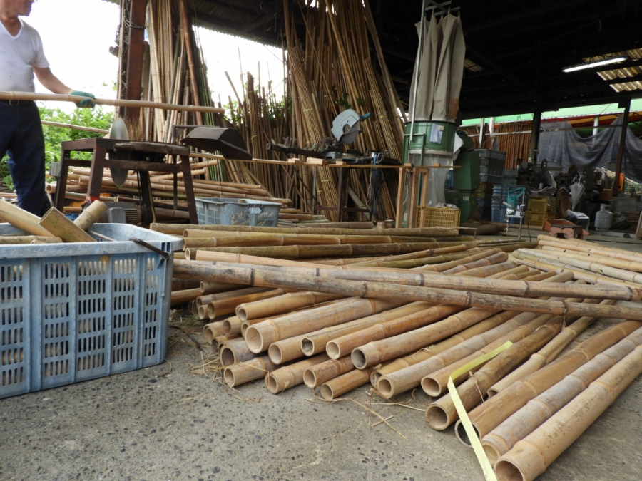昭和32年に法人化したが、現在のご主人で三代目に当たる竹屋さん。割り竹・丸竹・萱などを加工販売されている。竹箒の生産から文化財の保全に使用される資材まで幅広い。